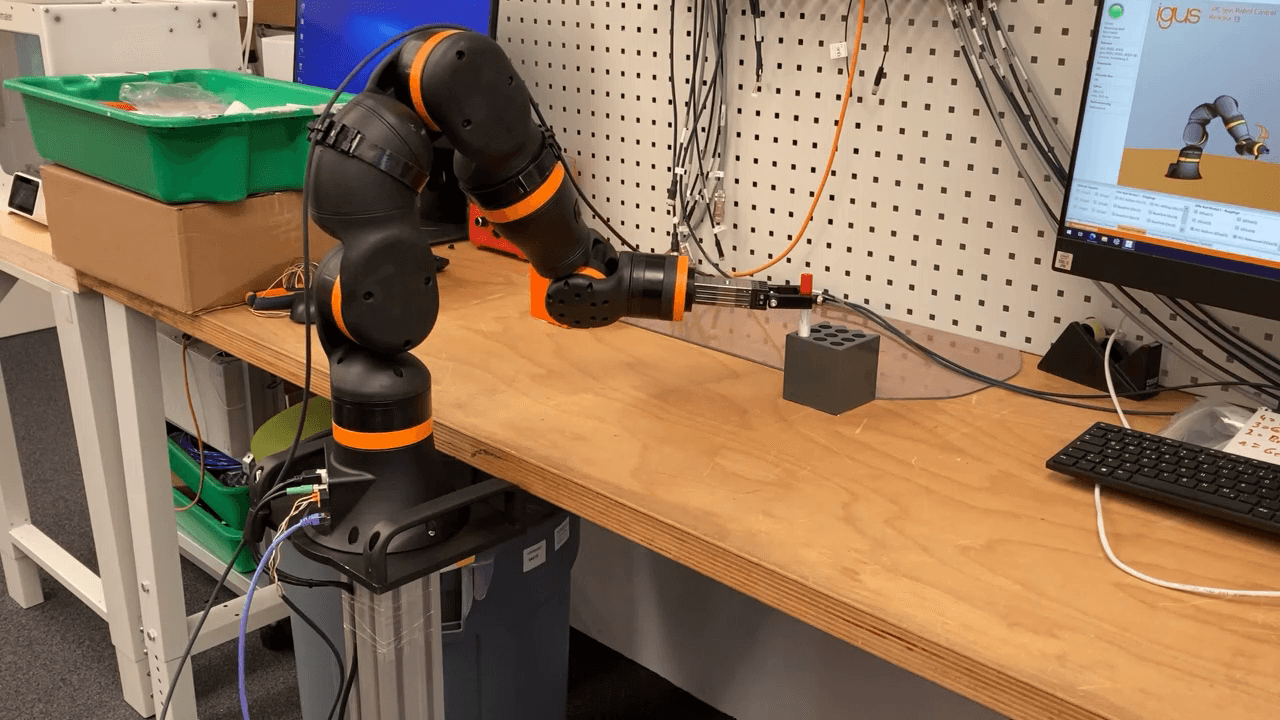 This customer test demonstrates a classic pick-and-place task, often required in laboratories and medical technology. Using a pen and two pen trays as a simulation, an igus ReBeL jointed-arm robot equipped with a Schunk parallel gripper executed programmed movements. The gripper efficiently picks up and places the pens, highlighting its capability to handle delicate components like test tubes in real-world applications. As a Cobot-certified ReBeL robot, it ensures safe collaboration in close proximity to human workers.