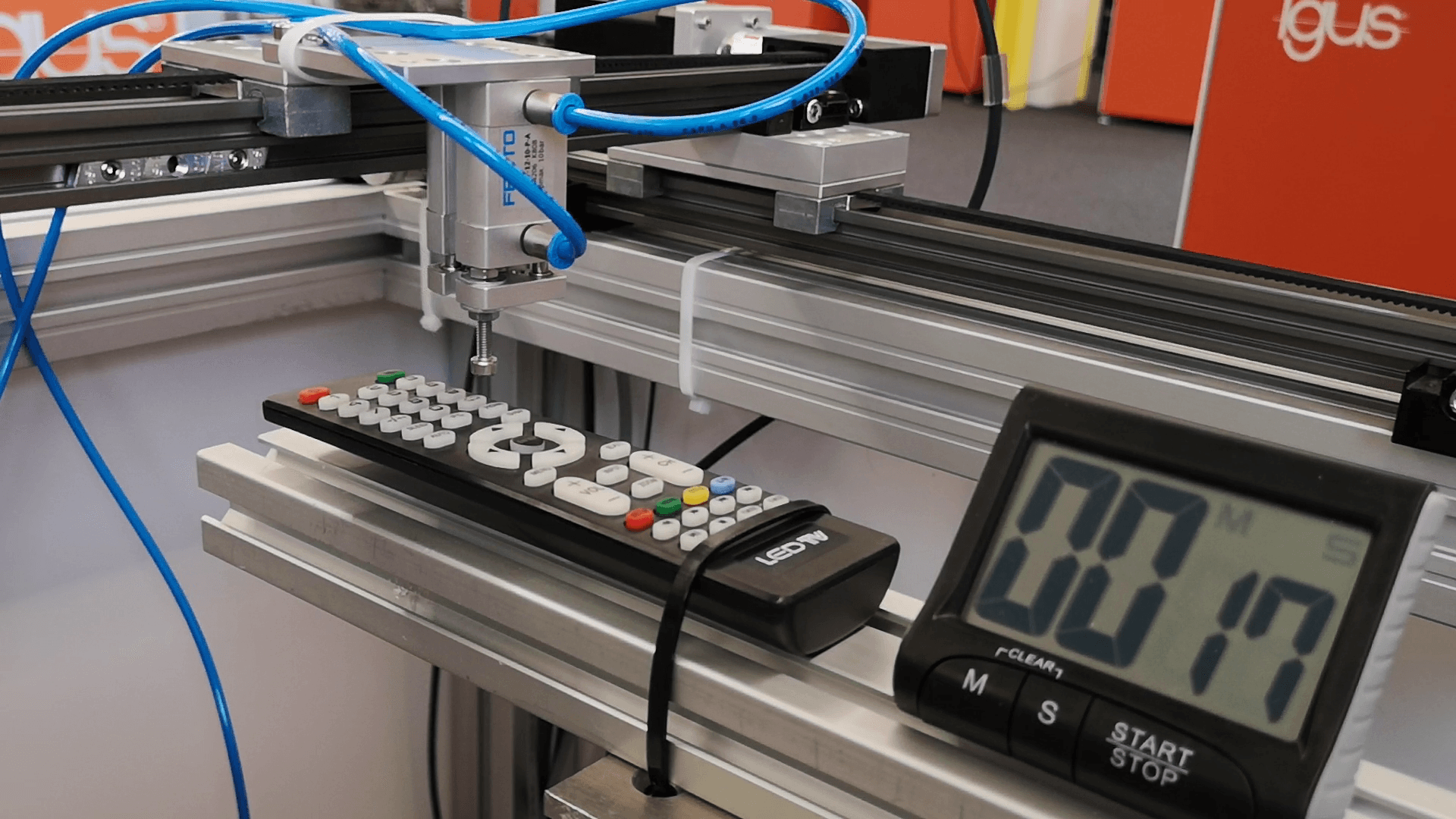 In this customer test, an igus area portal equipped with an end effector was used to automate the quality control of remote controls. The system was configured to test each remote control within a specified cycle time, ensuring compatibility with the customer's production requirements. By automating this repetitive process, the solution demonstrated how robotics can efficiently streamline quality assurance workflows, guaranteeing reliability and consistency for large-scale production environments.